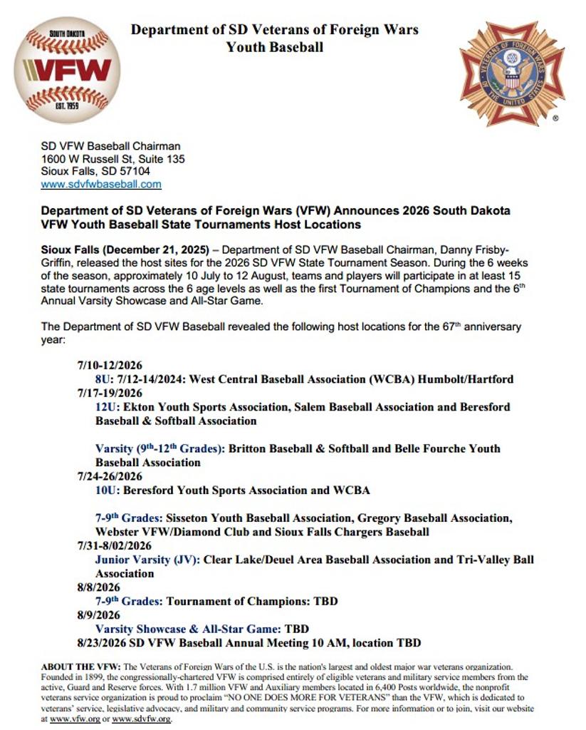 2026 SD VFW Baseball Annual Meeting: 8/23/2025 10 AM Location TBD